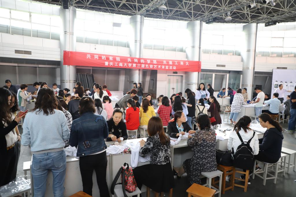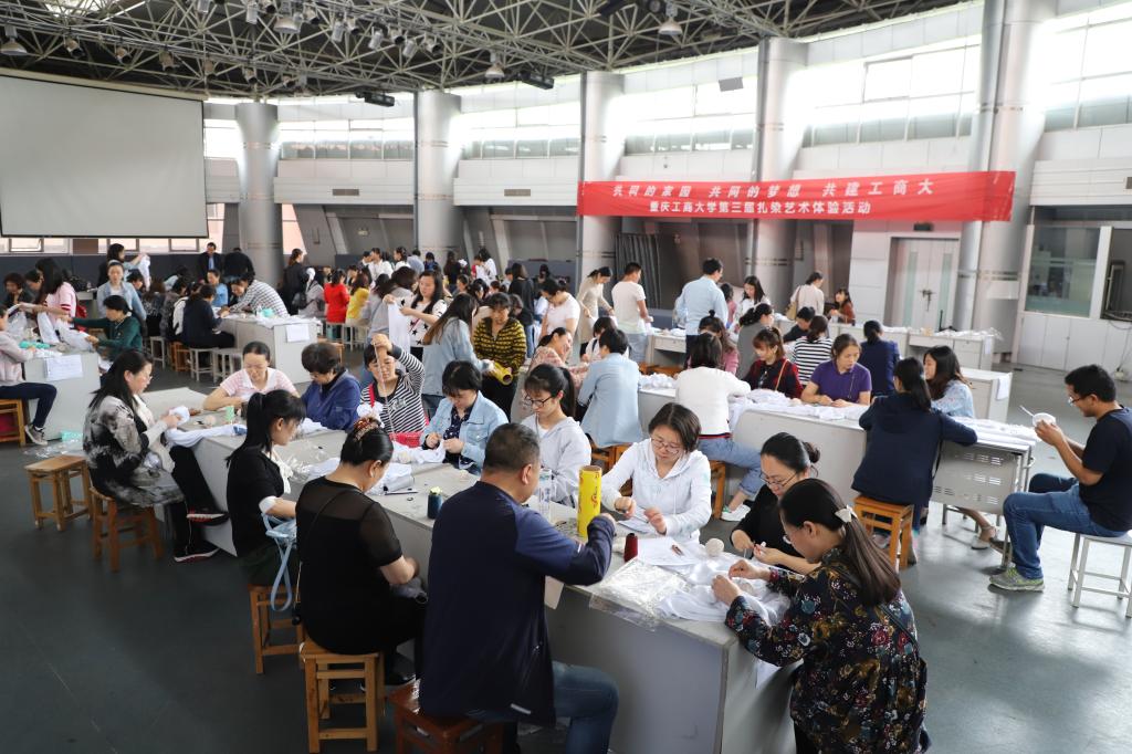 为帮助广大教职工更好地体验和感受艺术,激发对艺术的热爱,提高艺术审美与实践能力,由校工会主办、艺术学院工会承办的太阳成tyc7111cc“共同的家园•共同的梦想•共建工商大”系列特色活动之第三届教职工扎染艺术体验活动于5月11日下午在南岸校区艺术楼二楼展厅举行。来自全校各部门工会的200余名教职工参加了本次体验活动。