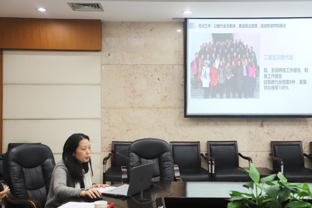 会上,学校23个部门工会以ppt展示的形式,就2018年的工作概况和亮点特色进行了简要汇报。一年来,各部门工会在校工会的指导和学院党政的领导与支持下,以习近平新时代中国特色社会主义思想为指导,深入学习贯彻党的十九大、全国教育大会和学校第三次党代会精神,围绕中心,服务大局,不断加强自身建设,切实履行工会组织的参与、维护、建设、教育四项职能,圆满完成了各项工作任务。一是落实教代会制度,积极参与本单位民主管理和监督。二是组织开展丰富多彩的文体活动和“结对子”活动,丰富职工业余生活,增强组织凝聚力和向心力。三是关心职工生活,开展慰问帮扶,进一步加强“职工之家”建设;四是开展技能竞赛,提高教职工的思想道德素质和业务能力。交流完毕,各部门工会对2018年度工会工作进行了投票互评。