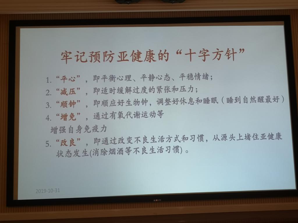 汪波主任医师是重庆大学附属肿瘤医院心理科学术带头人,中华医学会精神病学分会常务委员,重庆医学会精神科专委会主任委员,从事心理卫生工作近30年,有丰富的临床工作经验。他从正确认识健康、心理健康的内涵、心理健康的现状、如何维护心理健康四个维度,解读了健康的重要性、心理健康的十条标准、不健康心理以及常见心理障碍(如睡眠障碍、焦虑障碍)的表现和应对措施。整个讲座,风趣幽默,深入浅出,不时赢得师生会心的笑声。