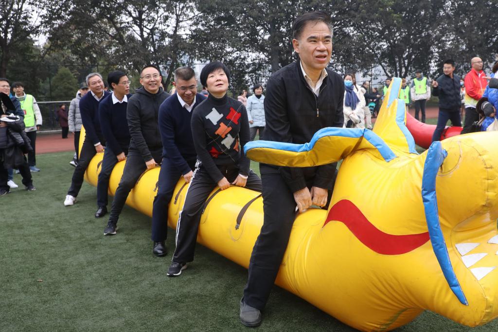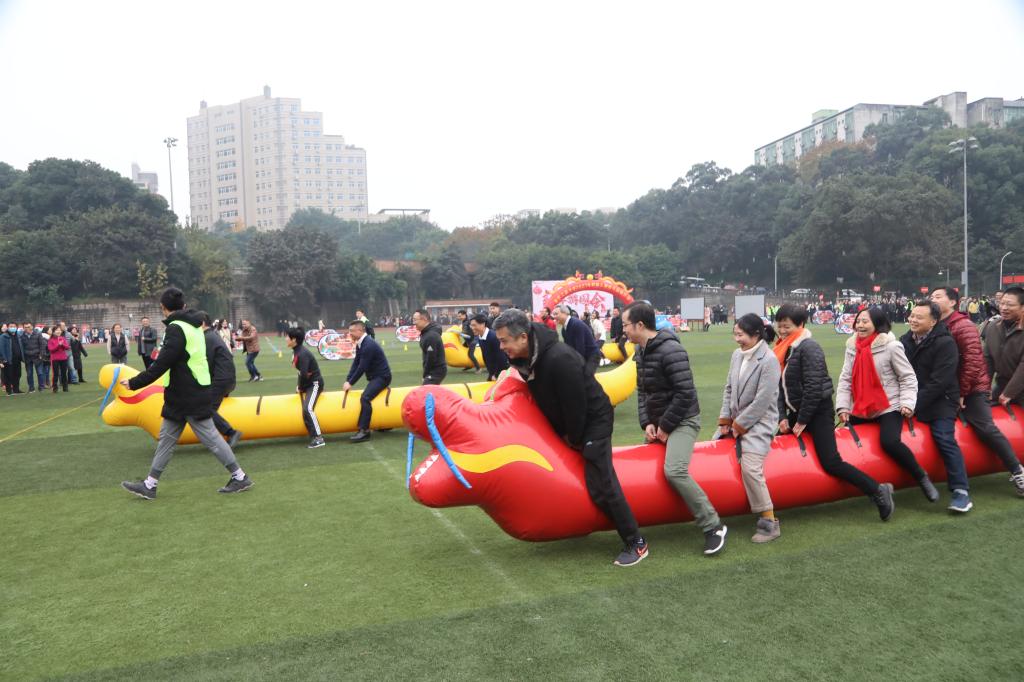 12月18日下午,学校2020年教职工冬季趣味运动会在南岸校区北区运动场举行,全校各部门工会21支代表队报名参加。校党委书记李志雄、党委副书记宋豫、副校长陈兴述、李国军、李敬、校党委常委华杰也来到现场,与教职工们一同参加运动会,一起为参加比赛的教职工们加油喝彩。