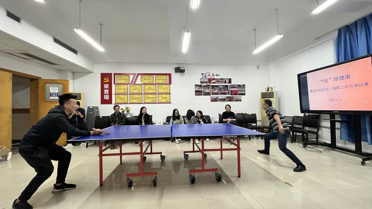 数学与统计学院工会组织学院坚守在岗的一线工作人员开展“‘疫’路健康”乒乓大赛,场上切磋技艺、高潮迭起、共叙友谊,场下掌声阵阵、喝彩声声、欢乐满溢,充分展示着教职工们积极向上、锐意进取、砥砺前行的精神风貌,彰显了在疫情当下敢冲敢拼、勇往直前的美好形象。