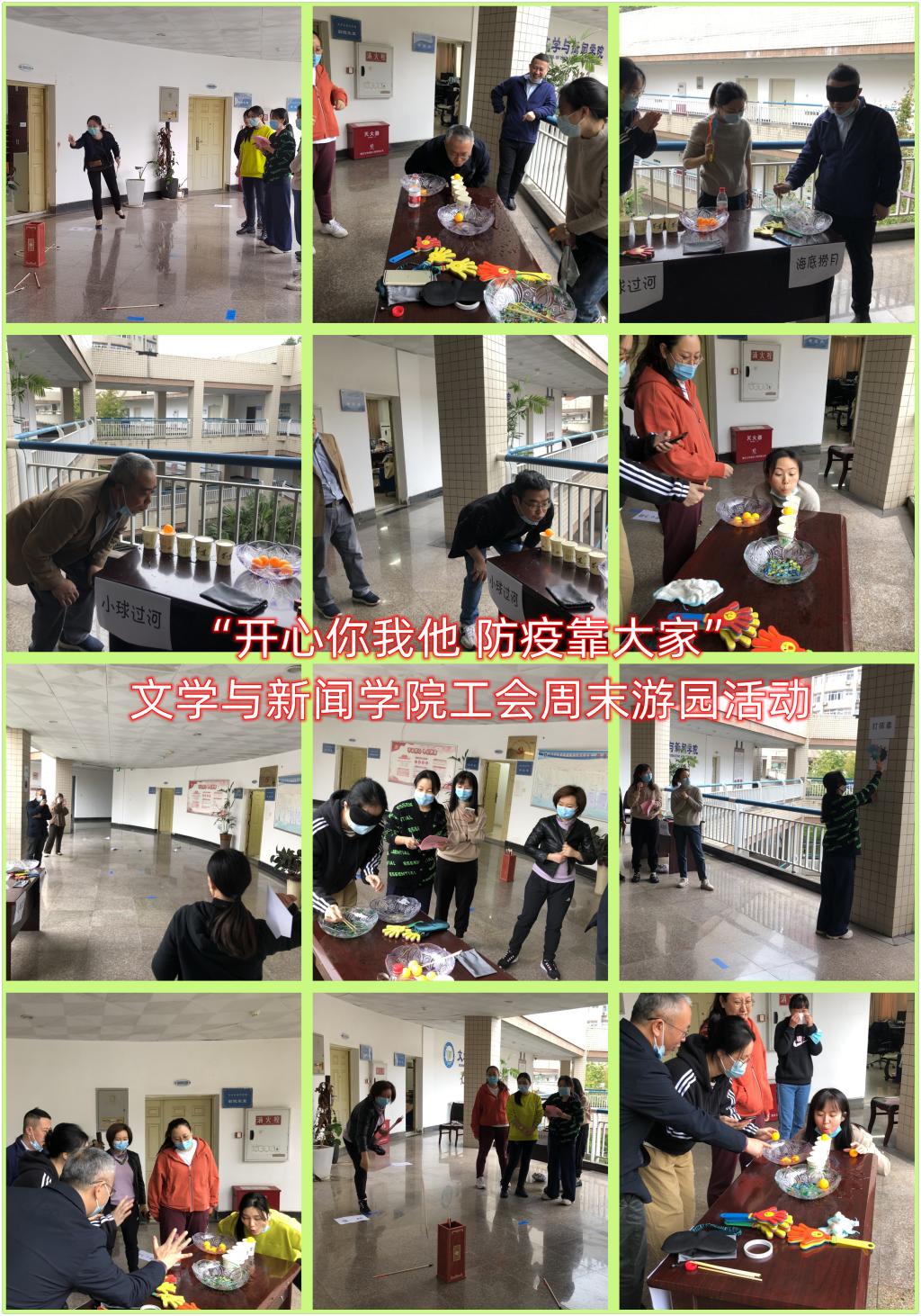 文学与新闻学院工会举办“开心你我他,防疫靠大家”周末游园会活动,设置“打病毒”、海底捞月、我心飞翔、小球过河、投壶等5个项目,在校抗疫教职员工积极参与,特别邀请到正在巡察教学楼工作的教务处骆东奇处长、胡卫军副处长参加活动。