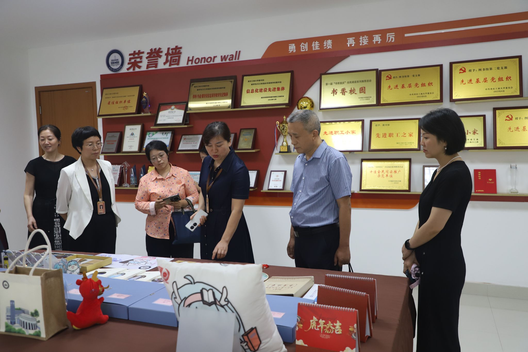 座谈结束,雷治政一行在王静等工会工作人员的陪同下,前往了全国模范职工小家——图书馆职工小家进行实地参观。图书馆党总支书记陈翠岚、工会主席吴孔珍热情接待,并详细介绍了图书馆分工会的人员构成、制度建设以及品牌工会活动,充分展示了图书馆职工小家在促进教职工学习交流、提升文化素养方面的积极作用。