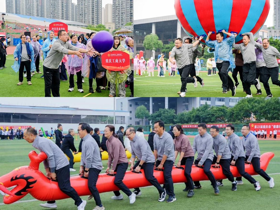 本届赛事设置了欢乐龙舟、灌篮高手、鸿运当头、擎天接力、圈速传递五个项目。比赛全程,校领导以“队员”身份深度参与,与全体队友并肩作战:“圈速传递”环节,曾维伦、任毅与大家手拉手形成闭环,灵活调整身体姿态,用最短时间完成圆环传递;“欢乐龙舟”开战时,张波与队员们双手抓住把手同步发力,彩龙在赛道上快速推进;“擎天接力”比拼中,张海燕、任毅与队员们交替传递,展现出团队的力量与默契;“鸿运当头”项目,张波与队员们共同扛起特制的巨型充气道具,紧握把手奋力往前冲;“灌篮高手”角逐时,曾维伦、张波、张海燕与队员们毫不退缩、冒雨坚守赛场,凝神聚力将球奋力投向篮筐。校领导与教职工同场竞技、共闯难关的场景,不仅点燃了赛场氛围,更让团队凝聚力在一次次协作中不断升华,成为本届赛事中令人印象深刻的温暖画面。