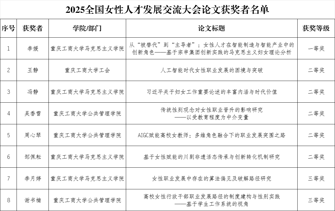 此次参会及获奖,不仅是对学校在女性人才研究领域长期学术积淀的充分肯定,更是学校落实人才强校战略、重视特色研究的生动体现。这一亮眼成绩,不仅为重庆和学校争得了荣誉,也进一步丰富了学校的办学内涵与品牌价值,为学校在同类院校中树立良好形象、增强社会认可度提供了有力支撑。未来,校工会将以此为契机,继续发挥桥梁纽带作用,积极服务教职工成长,为广大教职工提升科研能力、展现学术风采提供有力支持与服务!