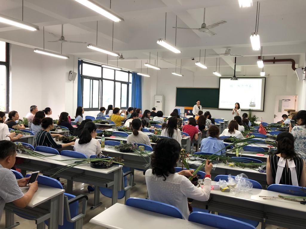 活动邀请到了中国花卉协会理事、重庆市花卉协会插花分会副会长兼秘书长、中国“文人花道”流派的联合创始人邓纪会老师为讲座嘉宾。邓老师首先向在座的老师简单介绍了花道的历史以及不同流派的特点,然后介绍了本次体验活动会使用到的花材及花器,最后着重讲解了中国传统插花的特色、构图以及造型。邓老师边讲解边示范如何运用不同的花材及花器进行搭配以创作出清新脱俗的作品。参会老师仔细聆听,并在邓老师的指示下饶有兴致地进行插花创作。插花期间,邓老师在教室来回走动,手把手指导老师们。活动接近尾声,邓老师对部分老师的作品进行了点评,肯定了大家的学习能力以及审美趣味。活动最后,老师们拿着自己的作品与邓老师合影留恋。