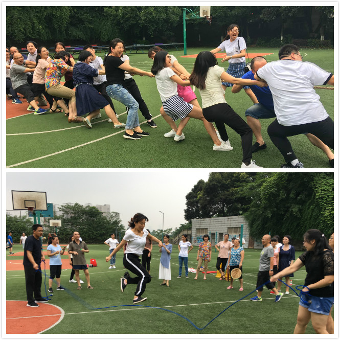 在欢乐的全家福合照后,趣味运动会正式开场。第一个项目是拔河比赛,两个部门工会都从自己阵营中挑选出身强体壮的精兵干将,比赛开始后对阵双方都士气高涨,卯足力气进行龙虎对抗,场边的加油声喝彩声震天,最后机关第十二分工会三局三胜完胜机械学院工会。第二个项目是3分钟接龙跳绳,双方各选出10名选手参赛。在这个环节中,机械学院的参赛选手身姿矫健配合默契,成功扳回一局。第三个项目是趣味定点投篮,双方选出男女各5名选手参赛。男队员篮板下运球至三分线投篮,女队员篮板下运球至二分线投篮,计算总进球数。机关第十二分工会以12比10的比分险胜机械学院工会。最后一个项目为五人制男女混合气排球,大家在这个环节里,不分部门,混合对抗,本着友谊第一比赛第二的精神。趣味运动会在一片欢乐融洽的氛围中圆满结束。