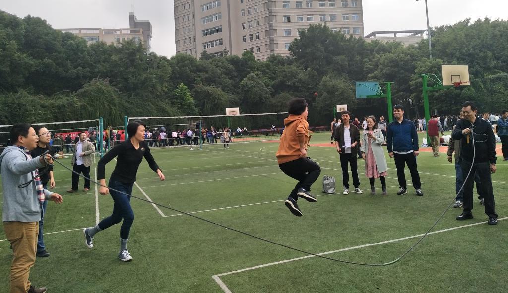在欢乐的全家福合照后,趣味运动会正式开场。第一个项目是拔河比赛,两个部门一共六支队伍,每队都从自己阵营中挑选出身强体壮的精兵干将,比赛开始后对阵双方都士气高涨,卯足力气进行龙虎对抗,场边的加油声喝彩声震天,大家都不停地为自己的阵营呐喊着。随着拔河比赛的落幕,紧接着第二个项目是定点投篮,每队派5名队员参加,每人投篮5次,以各队投篮总分计算排名,投篮过程中大家的欢呼声此起彼伏,为队员加油打气。第三个项目是1分钟接龙跳绳,每队各选出8名选手参赛。在这个环节中,参赛选手们都身姿矫健、配合默契。接着是羽毛球表演赛,各队羽毛球爱好者自由组队进行表演,大家在这个环节里,不分队伍,混合对抗,本着友谊第一比赛第二的精神。最后,学院领导为各参赛队伍队颁发奖状及奖品。
