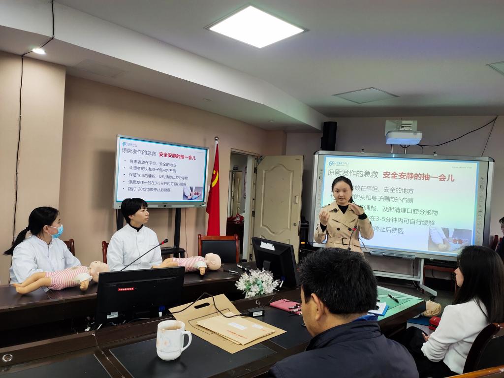 此次活动邀请到重庆医科大学附属儿童医院重症医学科“青年文明号”的医护人员周昉副主任医师,通过案例讲解、观看视频、互动答疑、现场演示等环节,为大家详细讲解了常见的急救的类型、急救的原则、急救的基本程序。同时,随行的儿童医院各工作人员热情邀请现场教职工上台实践,学习急救的操作过程,并对各项急救动作进行指导和点评。此次讲座由综合办公室副主任李玲主持,全院教职工加了活动。