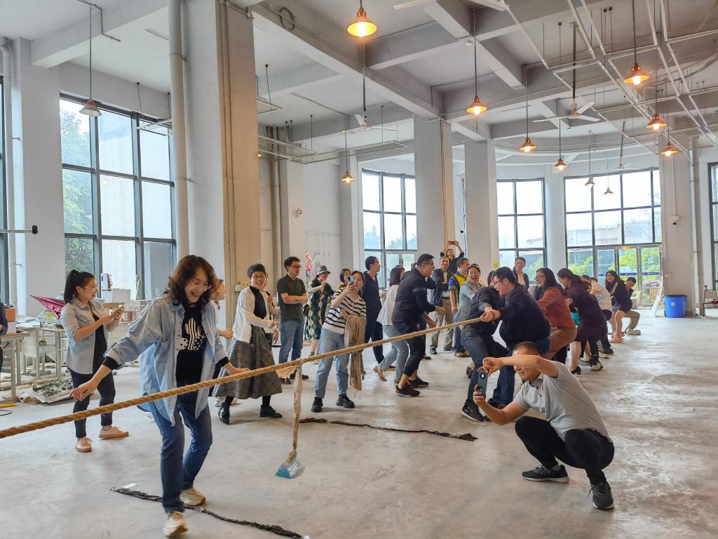 比赛根据教职工报名情况分4个队进行,比赛根据两院系、办会员报名情况分为4支代表队,比赛开始前抽签分为两个半场进行预赛,胜者进行冠亚军争夺。当比赛哨声响起,参赛队员们紧握长绳、卯足了劲儿使劲往后拉。未上场的老师自发在旁边当啦啦队,为参赛老师呐喊助威,赛场气氛十分热烈。经过激烈争夺,现代国际设计艺术学院代表队荣获比赛冠军。