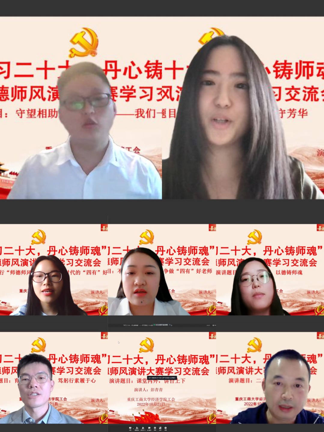 10月21日,在党的二十大召开之际,经济学院党委和工会举行了学习二十大报告暨师德师风演讲比赛,因疫情防控需要,本次学习和比赛活动采取了线上的方式,全院100余名教职工参加了在线活动。