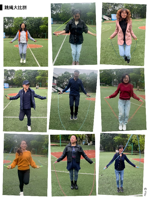比赛分年龄段进行,只见参赛选手们一字排开,个个铆足了劲儿,表情即紧张又喜悦,表现出了志在必得的信心。哨声一响,跳绳立刻舞起了风声,老师们就像空中跳跃的小精灵,绳子在他们的脚下“嗖嗖”地穿过,表现出了不凡的实力。