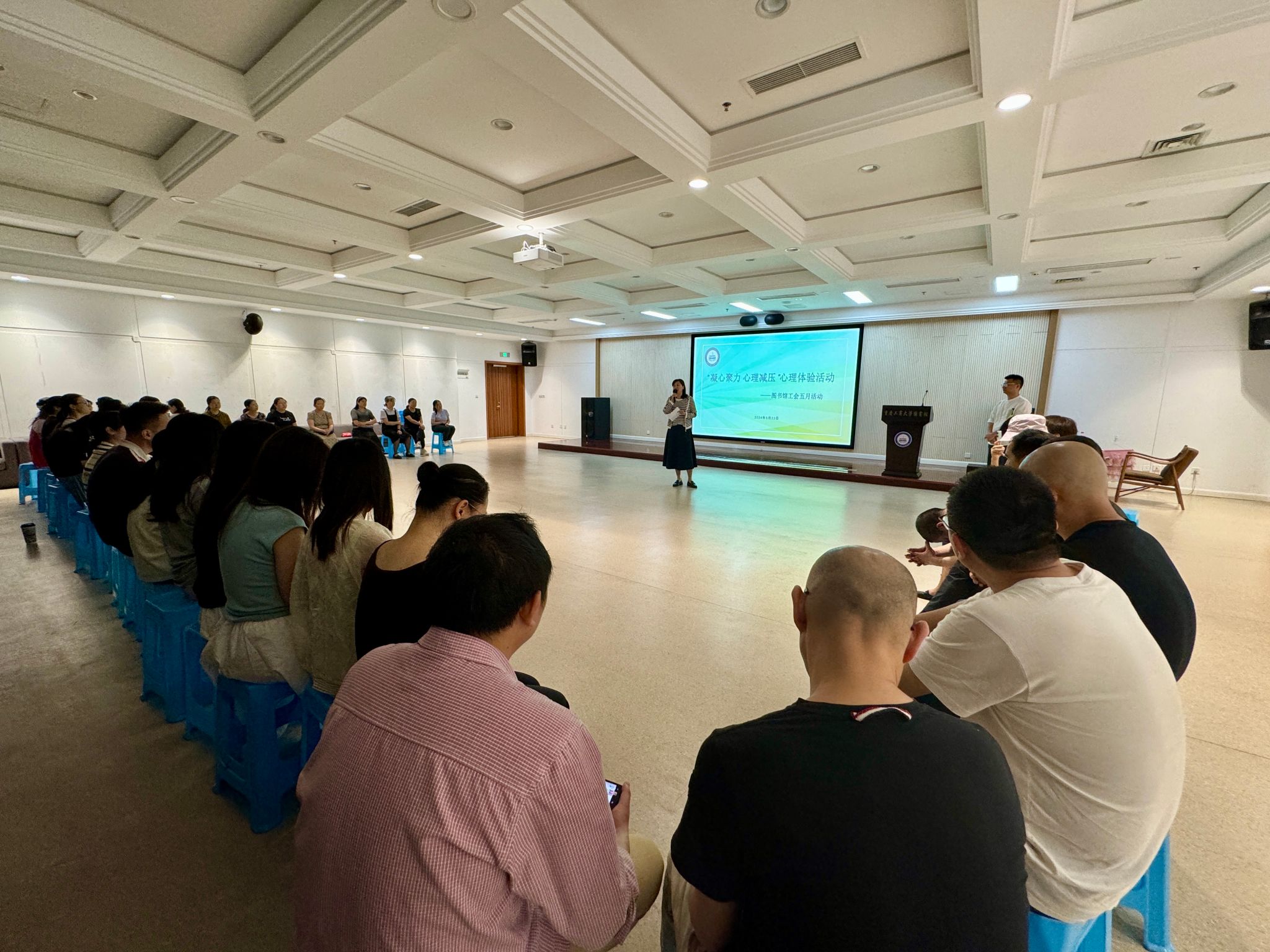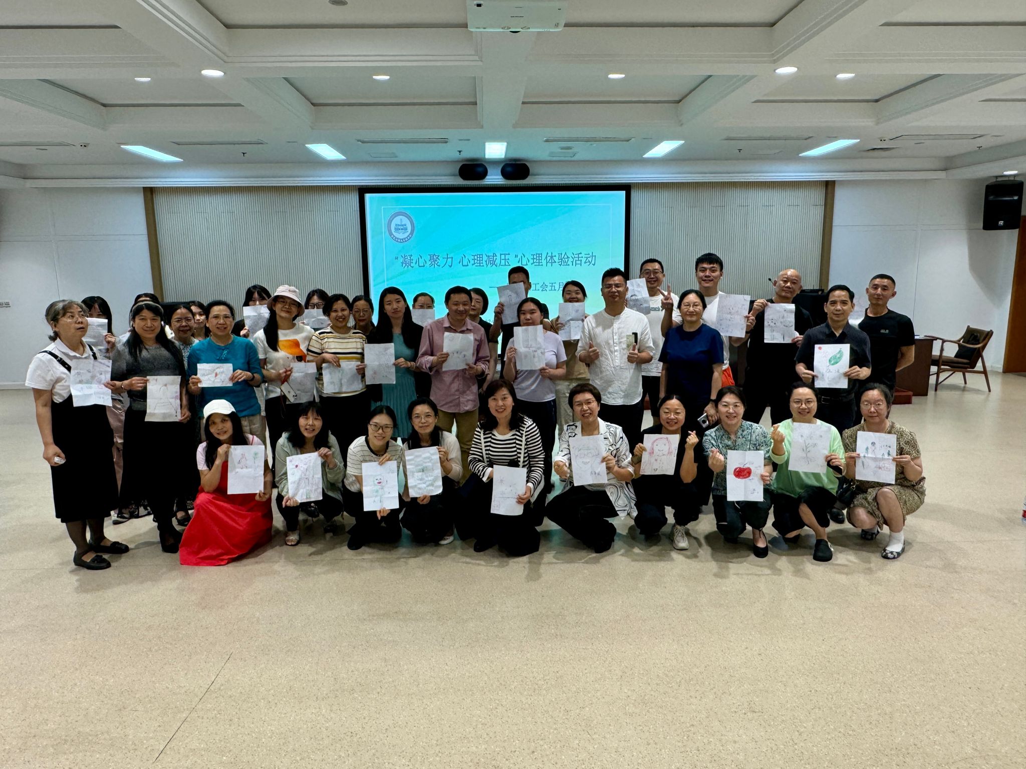 5月23日图书馆工会在视听阅览室开展“凝心聚力·心理减压”心理体验活动,活动由我校心理咨询中心的周明老师主持,40名教职工积极参与。