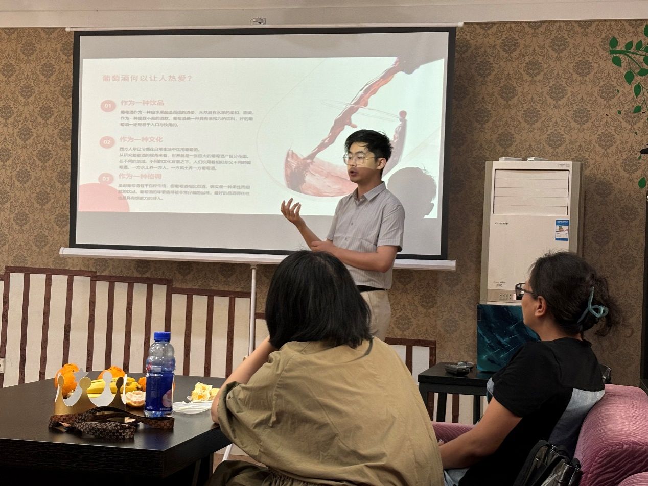 本次活动特别邀请2014级校友裘佩然老师担任主讲嘉宾。裘老师以其丰富的葡萄酒知识和实践经验,为在座的老师们带来了一场深入浅出的红酒知识盛宴。裘老师从葡萄酒的基础知识讲起,带领大家领略了葡萄酒的起源、酿造工艺、以及品鉴的艺术,同时结合生动的影音资料和鲜活的案例,使得讲解既具学术性又充满趣味性。