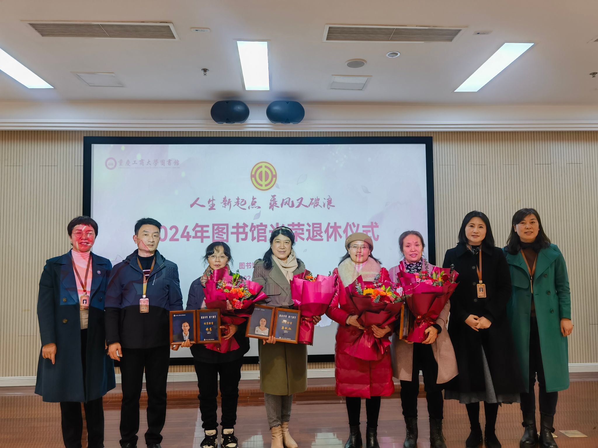 12月19日上午,图书馆工会在视听阅览室为2024年退休的史丽芳、周发容、刘桂南、张慧、张琼华、康秋红六位举行了一场隆重而温馨的光荣退休仪式,图书馆全体教职工参加,仪式由工会委员张颖主持。