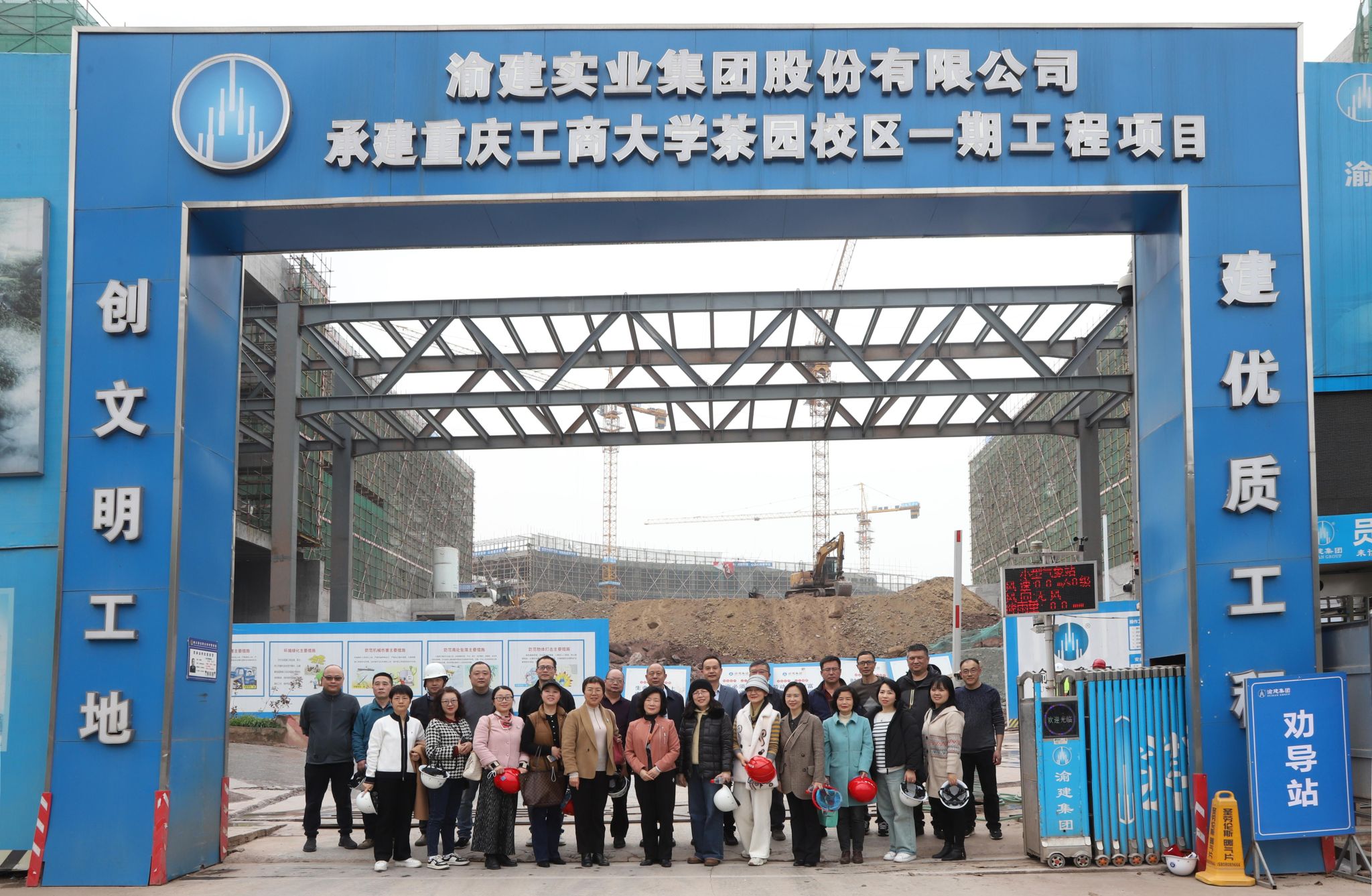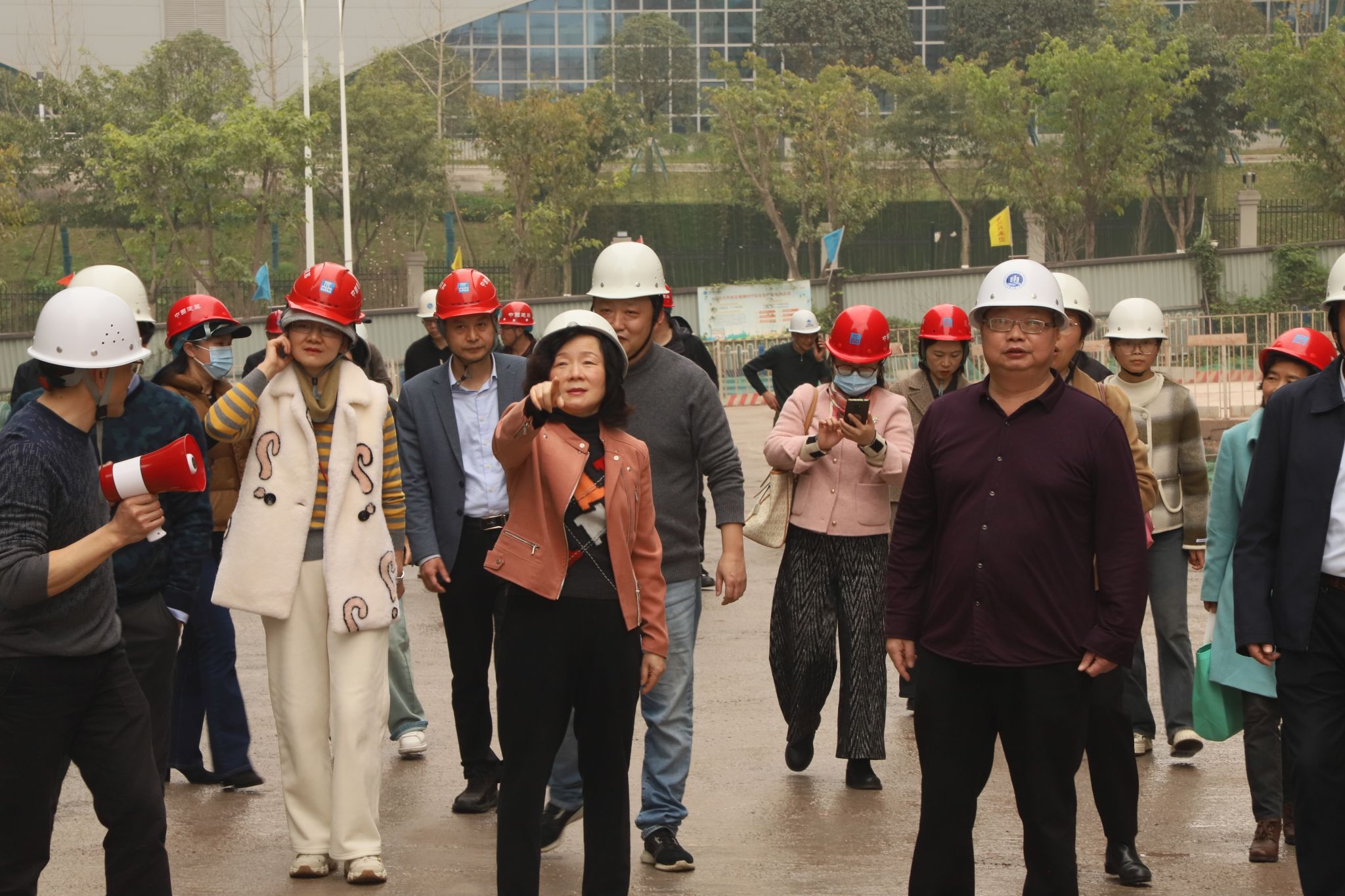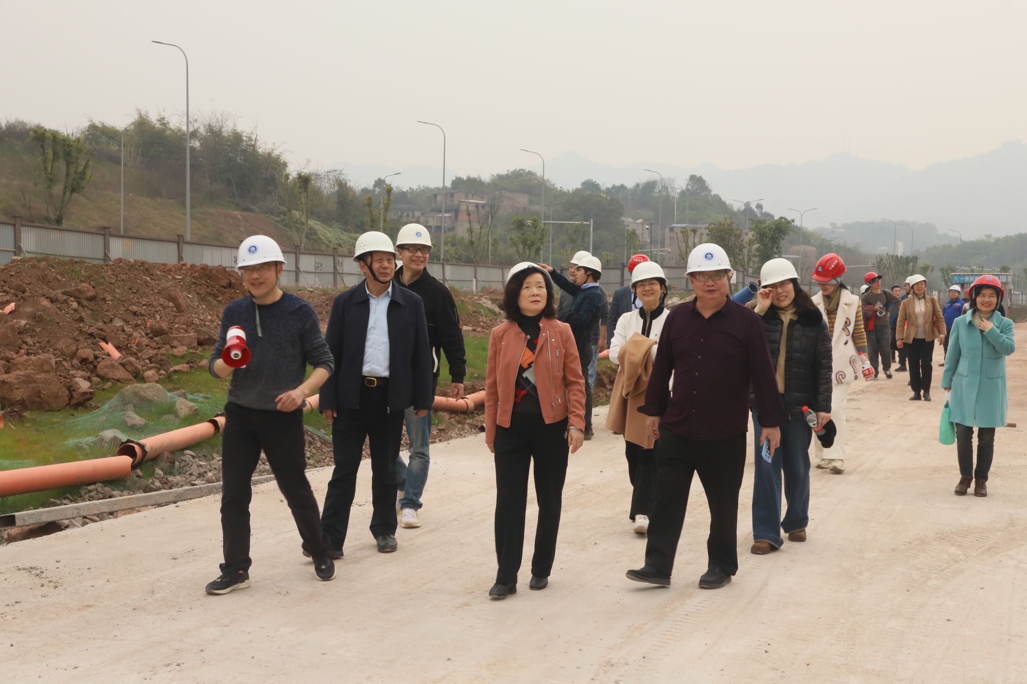 在新校区建设指挥部办公室主任李长兴的陪同下,代表们对茶园校区的重点工程进行了实地考察。他们仔细查看了施工现场,直观地了解了工程建设的整体规划、进展情况。