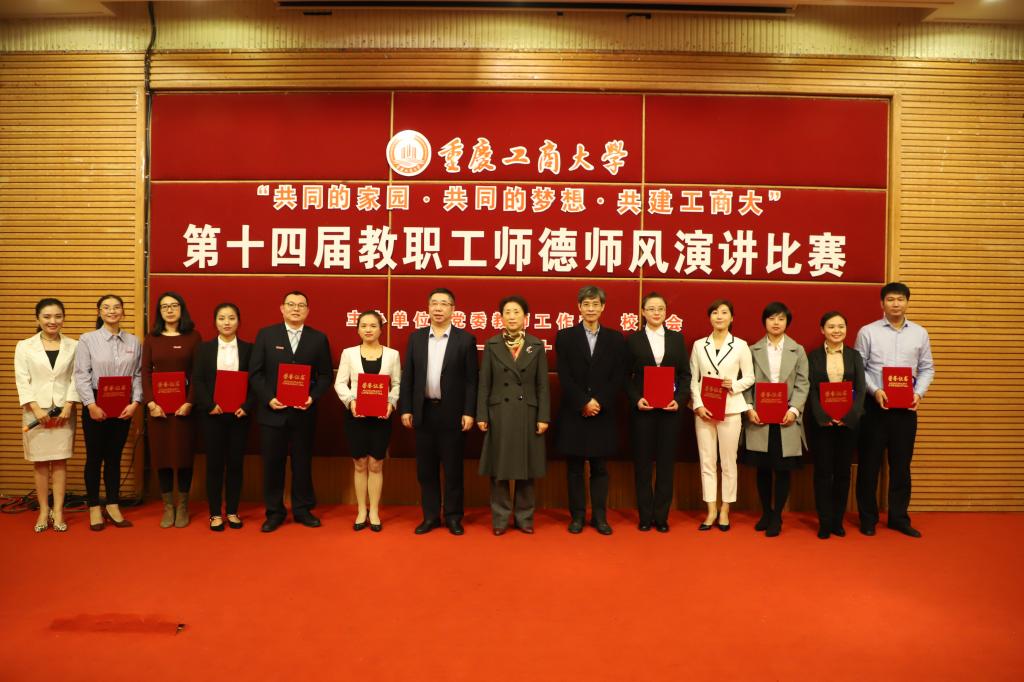 十名选手演讲结束后,由通识学院党总支书记、院长包晓玲,校团委副书记杨娟、环境与资源学院韦晓兰、商务策划学院张彦、外语学院汪越骐五位老师组成的专家评审团以及来自各部门工会推荐的大众评委们经过公平公正的评判,最终来自经济学院的许岩老师演讲的《师德,责任与爱的诠释》荣获一等奖;体育学院彭朝霞演讲的《我是老师,初心不变》、商务策划学院曾倩演讲的《回归初心,无问西东》和党委组织部蒋欣然演讲的《牢记使命,做一名优秀教师》荣获二等奖;环境与资源学院古兴兴演讲的《牢记使命,立德树人,争做新时代学生满意教师》、派斯学院王洪春演讲的《让花盛开在最安静的地方》、党委宣传部马玉姣演讲的《不忘初心,砥砺前行,做优秀宣传思想工作者》、通识学院周涛演讲的《因为爱,所以爱》、管理学院谭予涵演讲的《用爱与责任诠释教育》和国际商学院唐筱华演讲的《心中有爱负重前行》荣获三等奖。