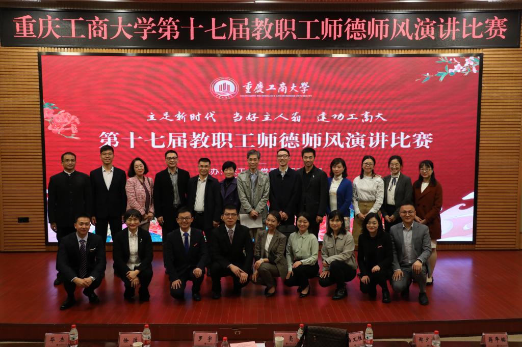 10月29日下午,由校工会、党委教师工作部联合举办的“立足新时代,当好主人翁,建功工商大”系列活动之第十七届教职工师德师风演讲比赛于博智楼7200报告厅举行。校党委副书记、校长孙芳城,校党委副书记宋豫,校党委常委、副校长陈运超、李敬,校工会常务副主席段远鹏及各学院分党委书记、工会主席,各学院教师和学生代表等300余人观看了演讲比赛。市委宣传部舆情信息处处长刘亮,市教科文卫体工会副主席罗宇,重庆邮电大学国际汉语、演讲礼仪教师杨文胜,重庆交通大学校报编辑部主任徐洁,党委组织部部长郑夕春,党委宣传部部长华杰、档案馆馆长蒋年韬担任评委。