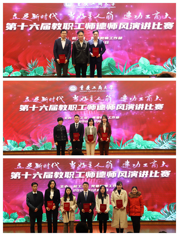 演讲结束后,经专家评审团以及大众评委们评判,艺术学院教师郭本玲演讲的《在平凡中追寻闪光》、管理科学与工程学院教师邓艺演讲的《用爱教会学生去爱》荣获一等奖,机械工程学院教师周利民演讲的《那时青年,初心不变》、人工智能学院教师向巧演讲的《乘风破浪,前路有光》、工商管理学院教师陈思演讲的《为师者,当榜样》荣获二等奖,经济学院教师贺嘉演讲的《学高为师,德高为范》、公共管理学院教师刘晓君演讲的《爱在工商,薪火相传》、会计学院教师陈震演讲的《师德虽旧,其命维新》、数学与统计学院教师易之瑶演讲的《师德是远航的风帆》和图书馆教师吴孔珍演讲的《我愿做一束光》荣获三等奖。李志雄、宋豫、陈兴述和柏群为获奖者颁奖。