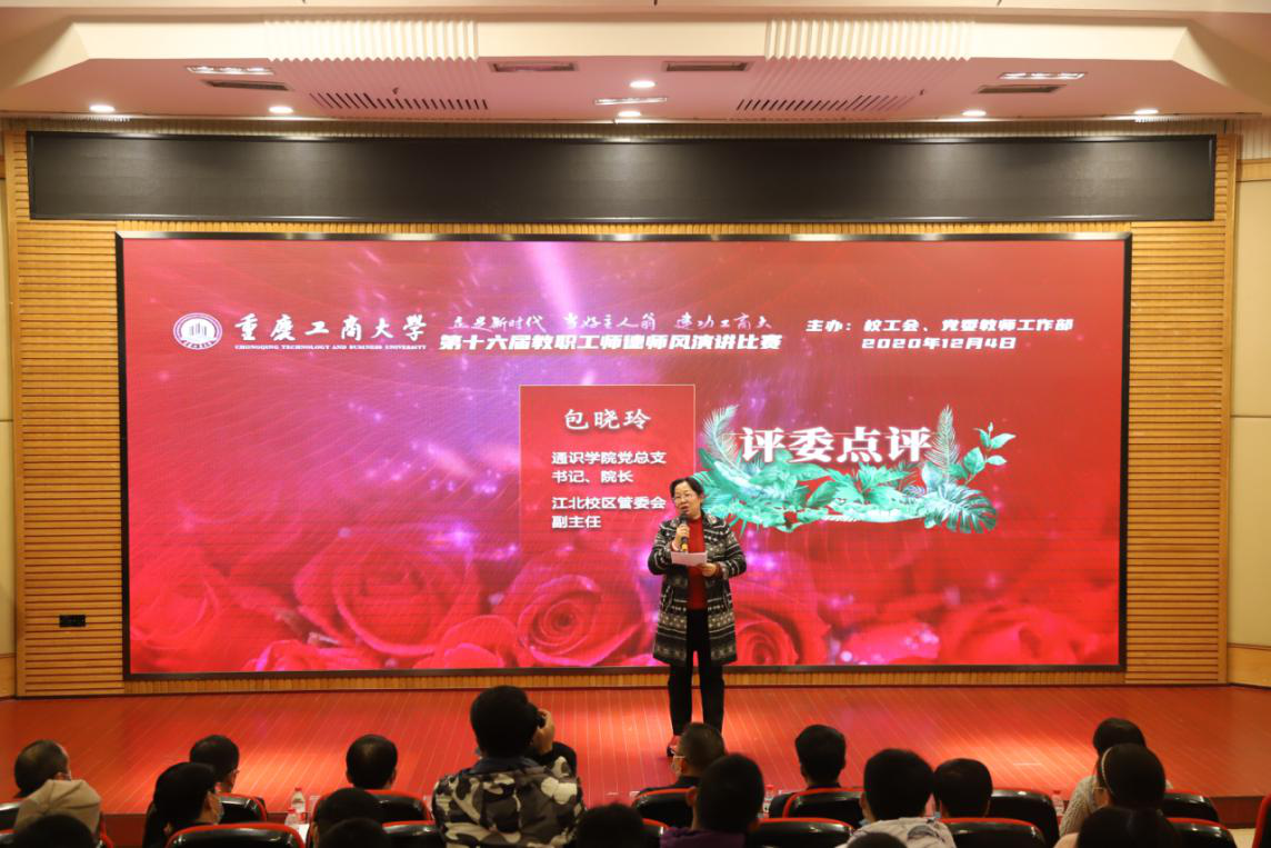 12月4日,由校工会、党委教师工作部联合举办的“立足新时代•当好主人翁•建功工商大”系列活动之第十六届教职工师德师风演讲比赛于博智楼7200报告厅举行。校党委书记李志雄,党委副书记宋豫,副校长陈兴述、柏群,校工会常务副主席段远鹏及各学院分党委书记、工会主席,各学院教师和学生代表等300余人观看了演讲比赛。比赛由校团委教师陈琛和王微主持,校党委宣传部部长华杰、纪委监察室主任米密、党委教师工作部部长林文军、档案馆馆长蒋年韬、通识学院党总支书记包晓玲、艺术学院分党委副书记邹奇、管理工程学院教授龚英担任评委。