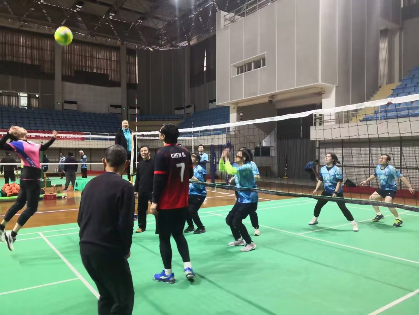 来自重庆大学教职工排球队的男女两支队伍与我校教职工气排球队男女队共计24名队员参加比赛,比赛邀请了重庆市南岸区老年气排球队杨军作为主裁判,我校排球队原主教练张新中、排球教师王春凤等5名退休教师作为技术指导和裁判员。比赛严格按照气排球比赛规则,分别组织了男队、女队、男女混合和两校混合共12场比赛。