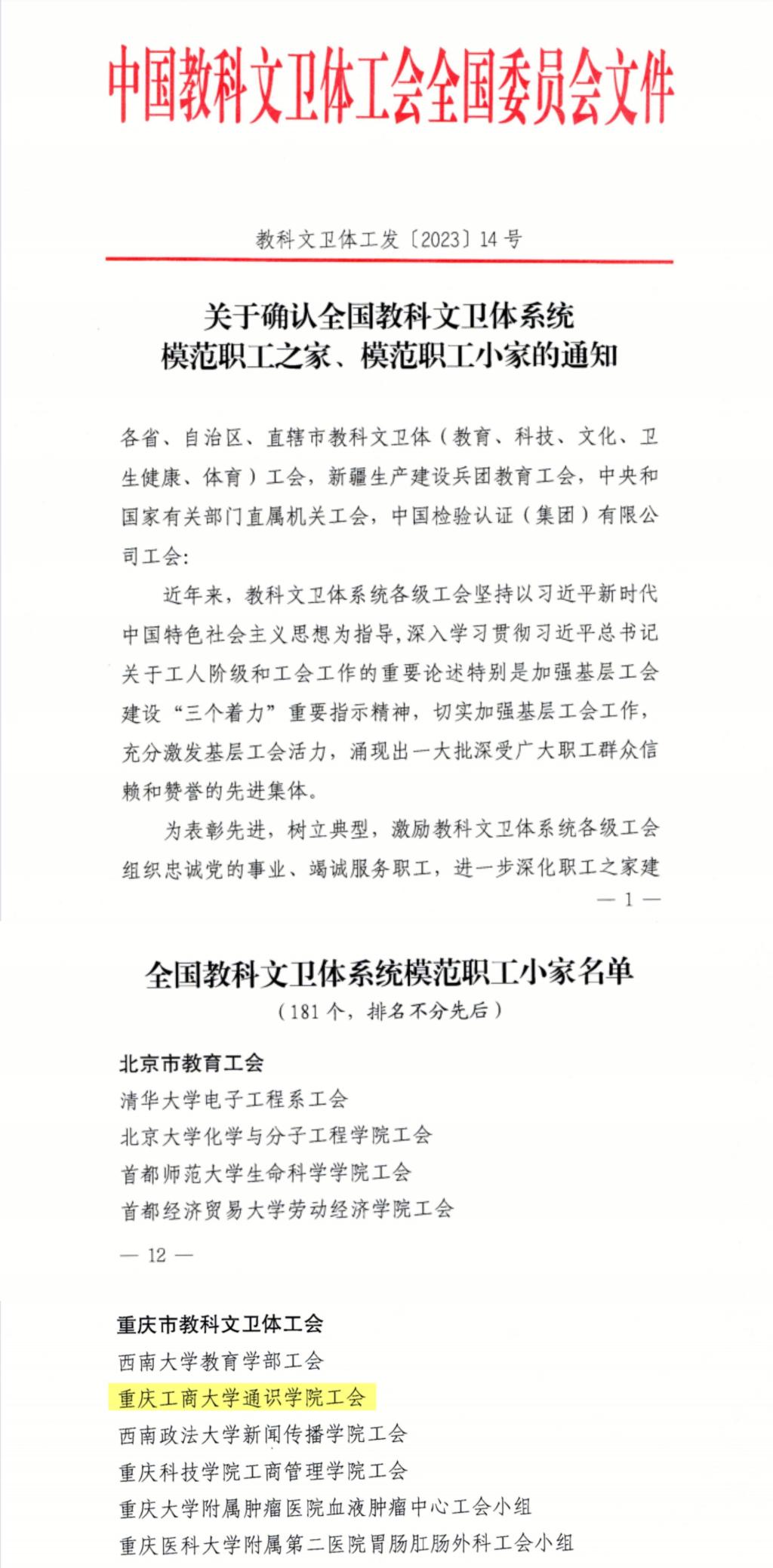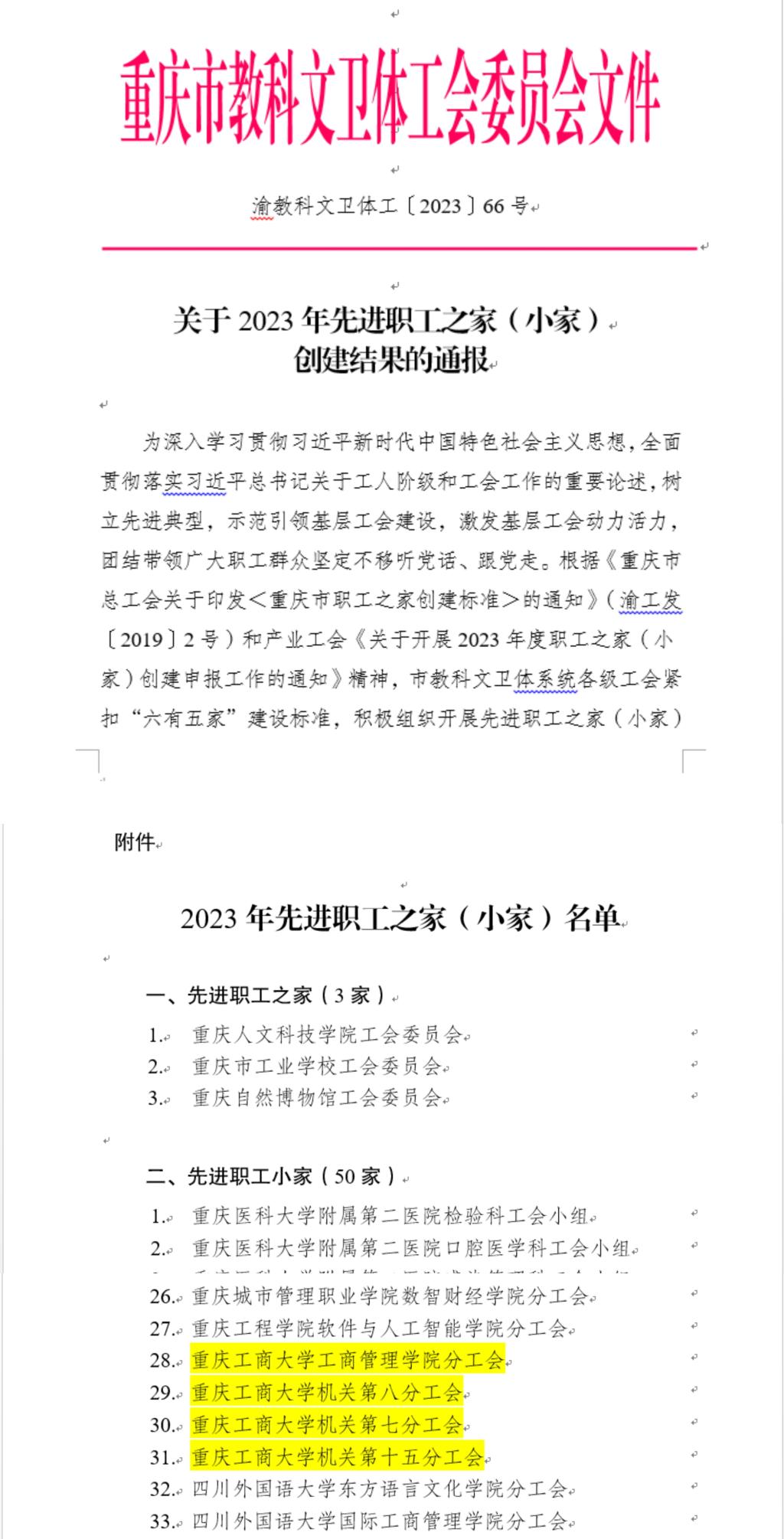 近日,中国教科文卫体工会全国委员会发布《关于确认全国教科文卫体系统模范职工之家、模范职工小家的通知》,我校通识学院工会职工小家荣获全国教科文卫体系统模范职工小家荣誉称号,全市共6个分工会获此称号。重庆市教科文卫体工会委员会发布《关于2023年先进职工之家(小家)创建结果的通报》,我校工商管理学院工会、机关工会第七分工会、机关工会第八分工会、机关工会第十五分工会四家职工小家荣获重庆市教科文卫体工会系统先进职工小家荣誉称号。