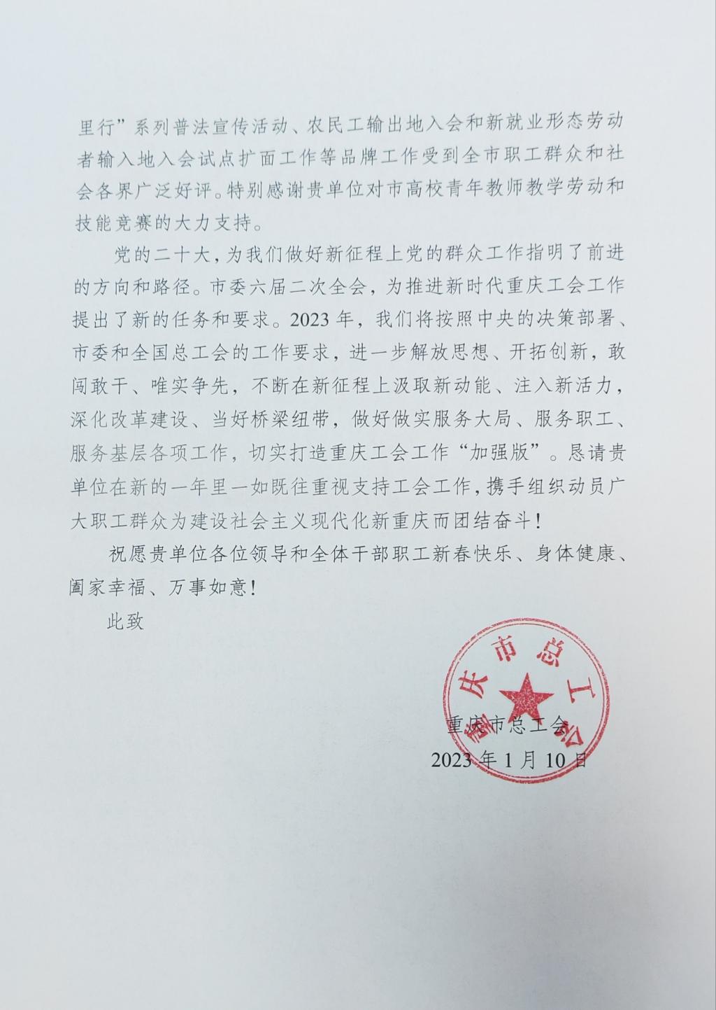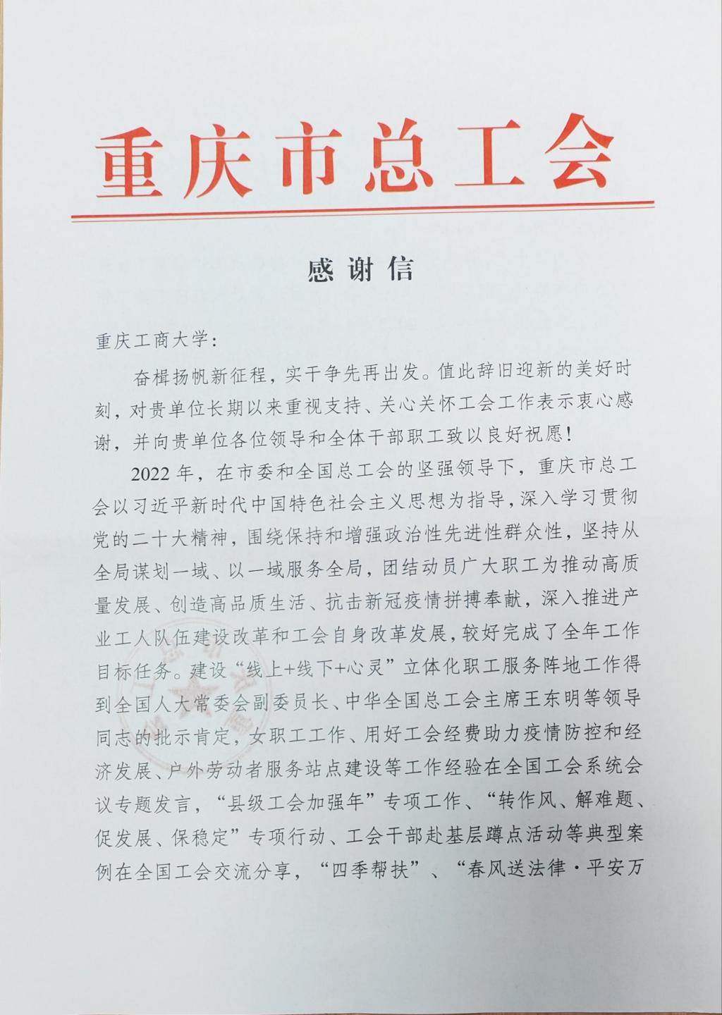 近日,学校收到重庆市总工会感谢信,感谢我校长期以来重视支持、关心关怀工会工作,特别感谢学校对市高校青年教师教学劳动和技能大赛的大力支持。据悉,这是我校第一次收到重庆市总工会感谢信。