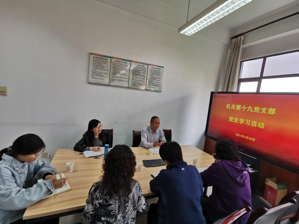 3月30日下午,机关党委第十九支部在厚德楼6009会议室召开了组织生活会,进行专题党史学习教育。会议由支部书记段远鹏同志主持。全体党员参加了学习。