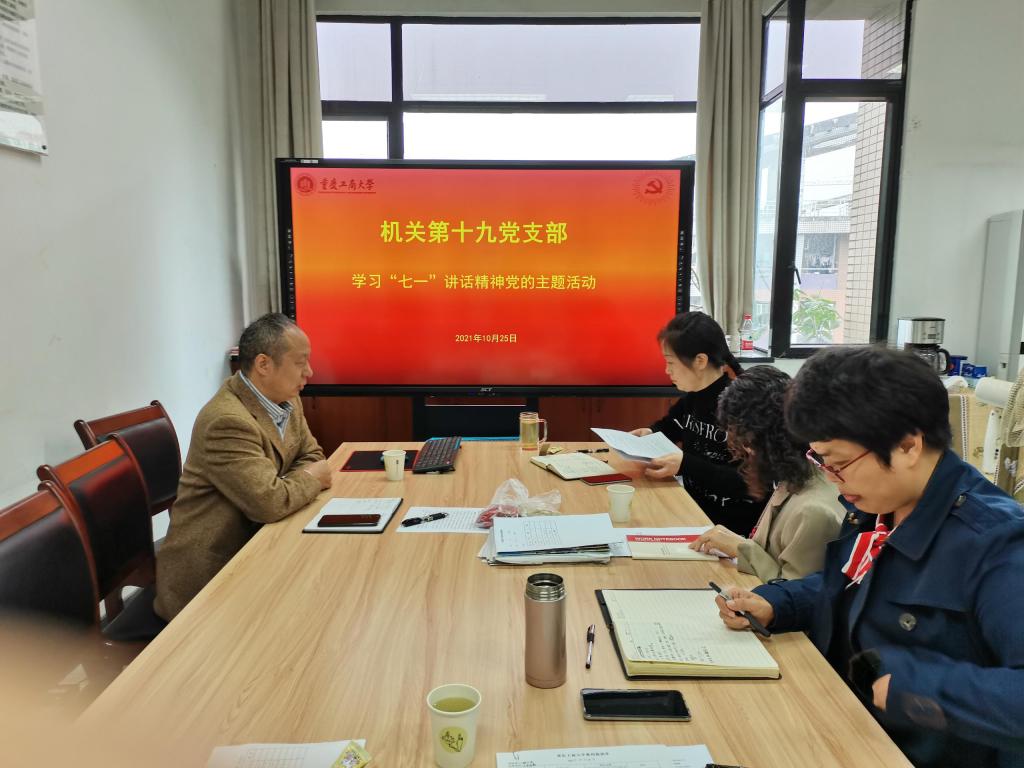 10月25日上午,机关党委第十九支部在厚德楼6009会议室召开了专题组织生活会,继续深入学习“七一”重要讲活精神。支部书记段远鹏同志主持会议,支部全体党员参加了会议。