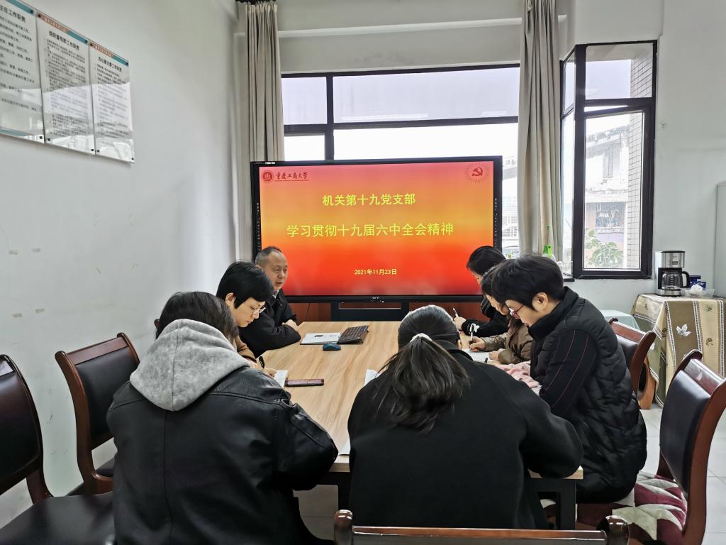 11月23日上午,机关党委第十九党支部在厚德楼6009会议室开展11月主题党日活动,集体学习党的十九届六中全会精神。会议由支部书记段远鹏同志主持,支部全体党员参加。