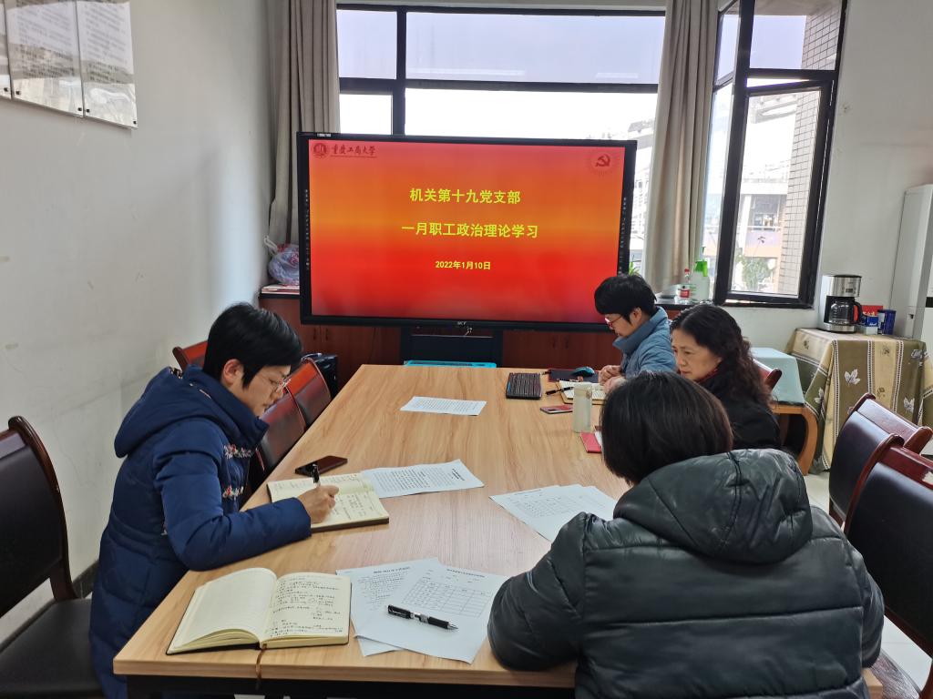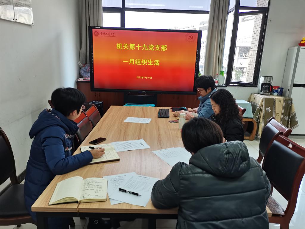 1月10日下午,机关党委第十九党支部在厚德楼6009会议室开展一月组织生活暨政治理论学习会。会议由支部委员刘玮同志主持,支部全体党员参加。